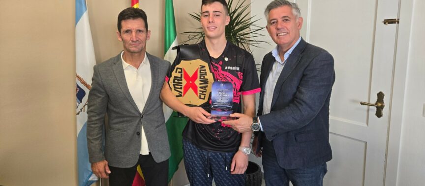El alcalde de Manilva, Mario Jiménez y el concejal de Deportes, Rogelio Pascual, han recibido en el Ayuntamiento al campeón mundial amateur de K1, Samuel de La Chica para entregarle un reconocimiento municipal al gran hito conseguido.